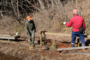 日時 令和 4 年 3 月 6 日(日) 9:00〜12:00 ・天神の里の冷え込みも一段落 ・本日出席に皆さん、同一作業に従事し、無事事故なく終了 今回の主な作業 ・「ひょうたん池」周回遊歩道の一部掛け替え ・「ひょうたん池」から「トンボの池」への魚道更新 |