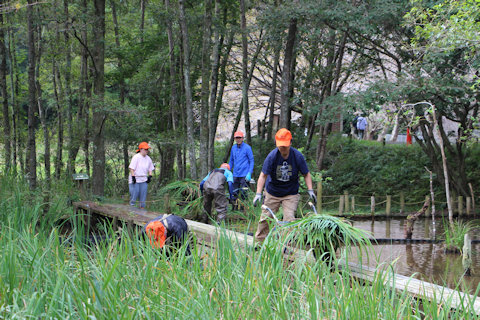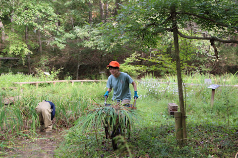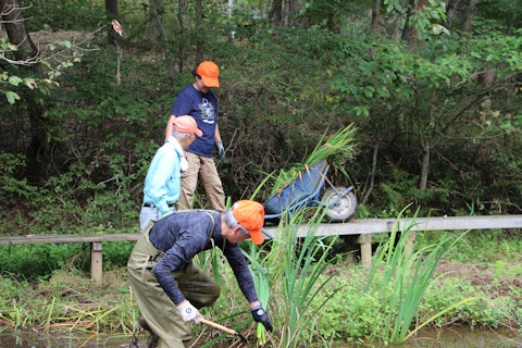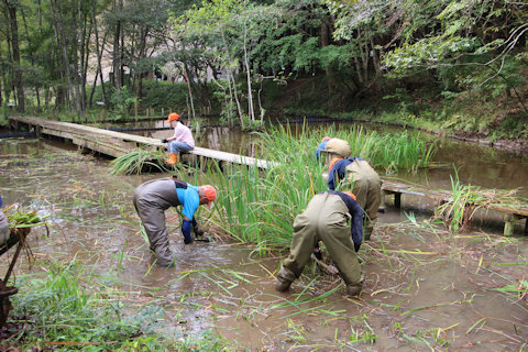ひょうたん池畔のカキツバタ刈り取り