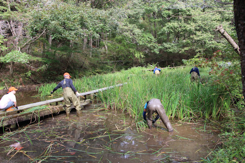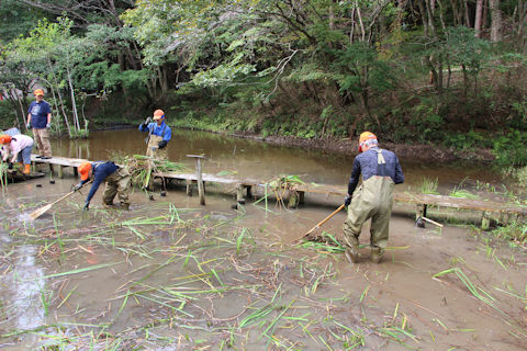 池畔のカキツバタを刈り取る