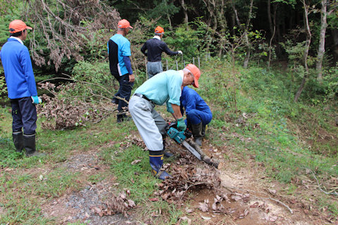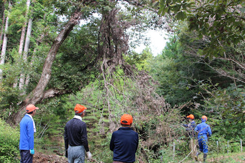 天神池入り口をふさぐ枯れ枝の除去