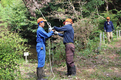 枯枝にロープを巻き付けヒッパラーを使って