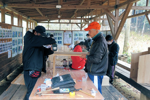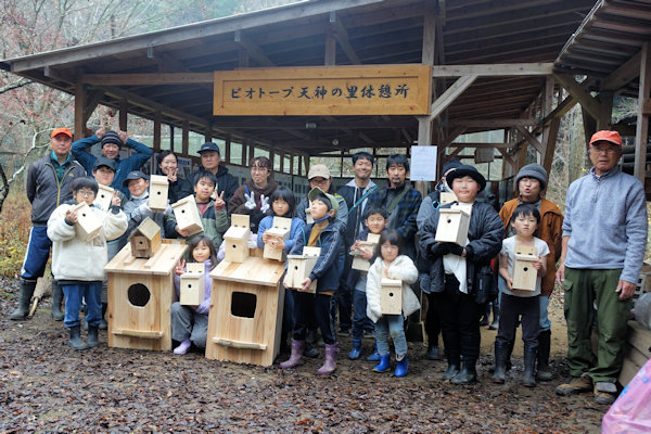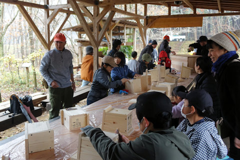 参加者全員の「ちから」を合わせてシジュウカラ用(ヤマガラ共用)の巣箱15個、フクロウの巣箱2個を
