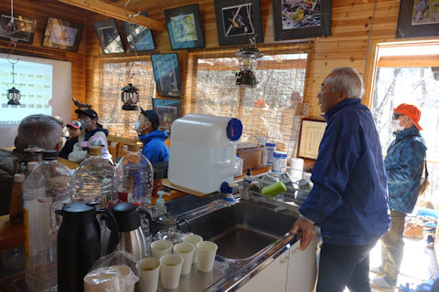 山小屋の前でヤマガラ、シジュウカラを観察