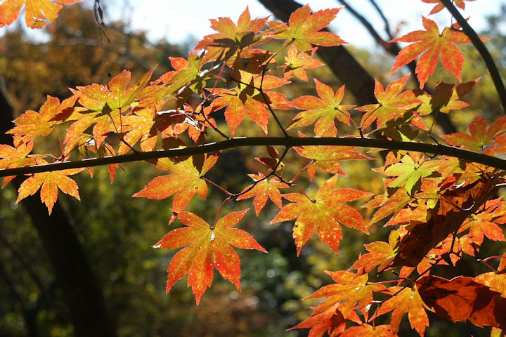 イロハモミジの紅葉。イロハニホヘトの7つの切れ込みがある(5〜6のものが多い)かわいい形の葉で、 モミジの代表選手。自生。