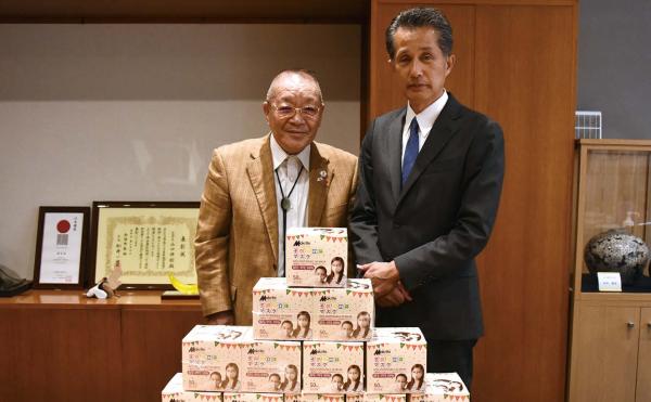 産業用マスクなどの不織布製品を手掛ける株式会社エス・ワイ・エムから市へ、こども用立体マスク1万枚を寄附いただきました。