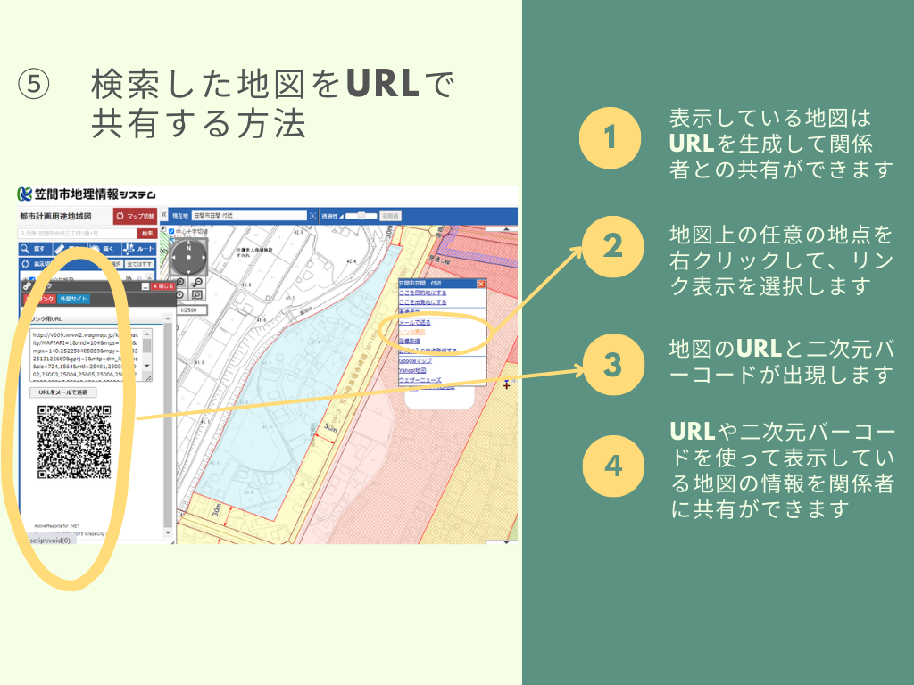 地図上の任意の地点を右クリックするとURLや二次元バーコードが表示されます。