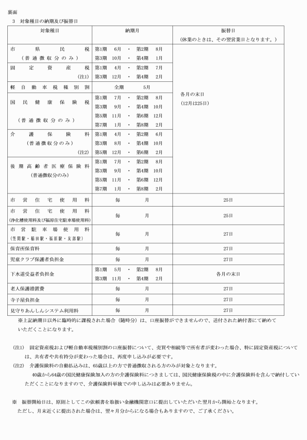 (1) 指定金融機関及び収納代理金融機関 納付者等が指定した期日又は口座振替納付の申込みをした日の属する月の翌月に到来する市長が指定した日とする。ただし、月末近くに申込みをした場合は翌々月とする。