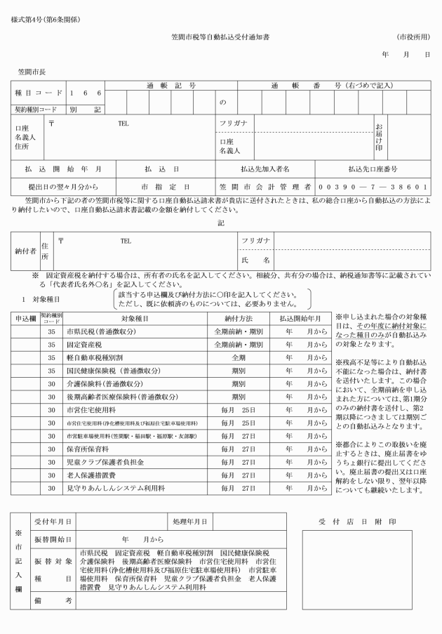 第6条 口座振替による納付を希望する納付者等は、笠間市税等口座振替依頼書(様式第1号様式第1号の2)又は笠間市税等自動払込利用申込書(様式第2号様式第2号の2)及び笠間市税等口座振替請求書送付依頼書(様式第3号)又は笠間市税等自動払込受付通知書(様式第4号)を取扱金融機関に提出しなければならない。