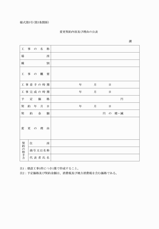 契約金額の変更を伴う変更契約をした場合、前記事項及び変更理由(令第7条第3項) | 契約後速やかに | ・変更契約内容及び理由の公表(様式第5号) |