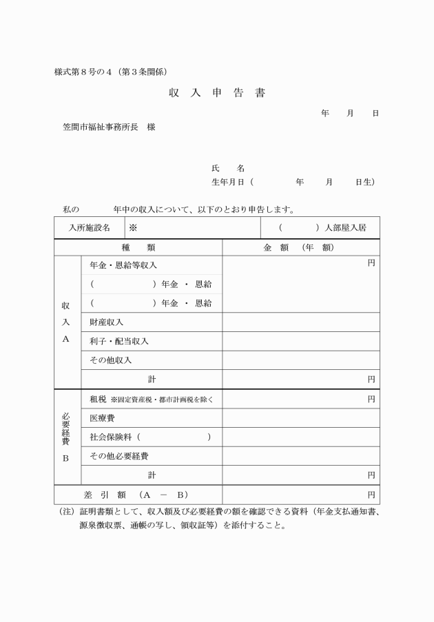 第3条 法第11条第1項の規定による措置を希望する者は、老人福祉法による措置申出書(様式第8号)及び次に掲げる書類を福祉事務所長に提出しなければならない。