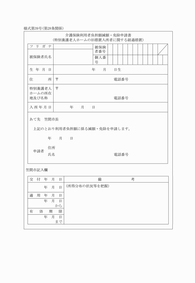 第23条の3 施行令附則第21条第1項の規定の適用による支給を受けようとする要介護被保険者又は施行令附則第22条第1項の規定の適用による支給を受けようとする要支援被保険者は、介護保険基準収入額適用申請書(様式第32号の4)を市長に提出しなければならない。