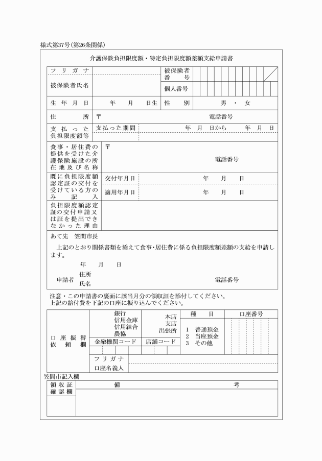 第26条 被保険者が、法第51条の3及び第61条の3の負担限度額又は施行法第13条第5項の特定負担限度額を、償還払いにより支給を申請する場合は、様式第37号に被保険者証及び領収証を添えて市長に申請するものとする。