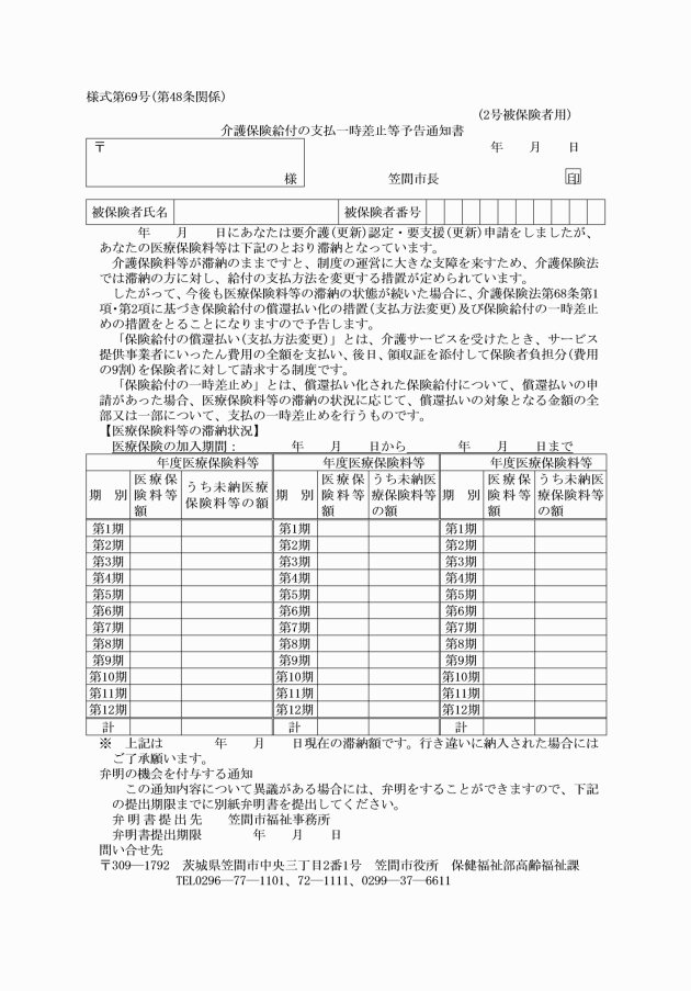 第48条 市長は、法第68条第1項の保険給付差止めの記載を行おうとするときは、様式第69号により当該被保険者に通知し、弁明の機会を付与するものとする。