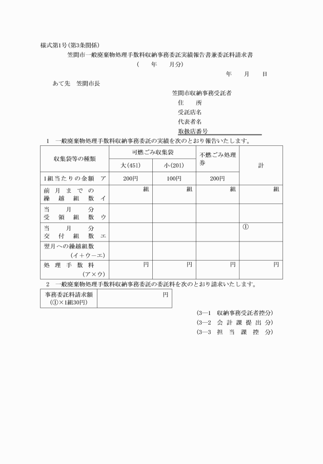 (3) 手数料の収納及び指定金融機関等への納付、笠間市一般廃棄物処理手数料収納事務委託実績報告書兼委託料請求書(様式第1号。以下「報告書」という。)の提出、公金の適正な処理並びに収集袋等の厳正な管理ができること。