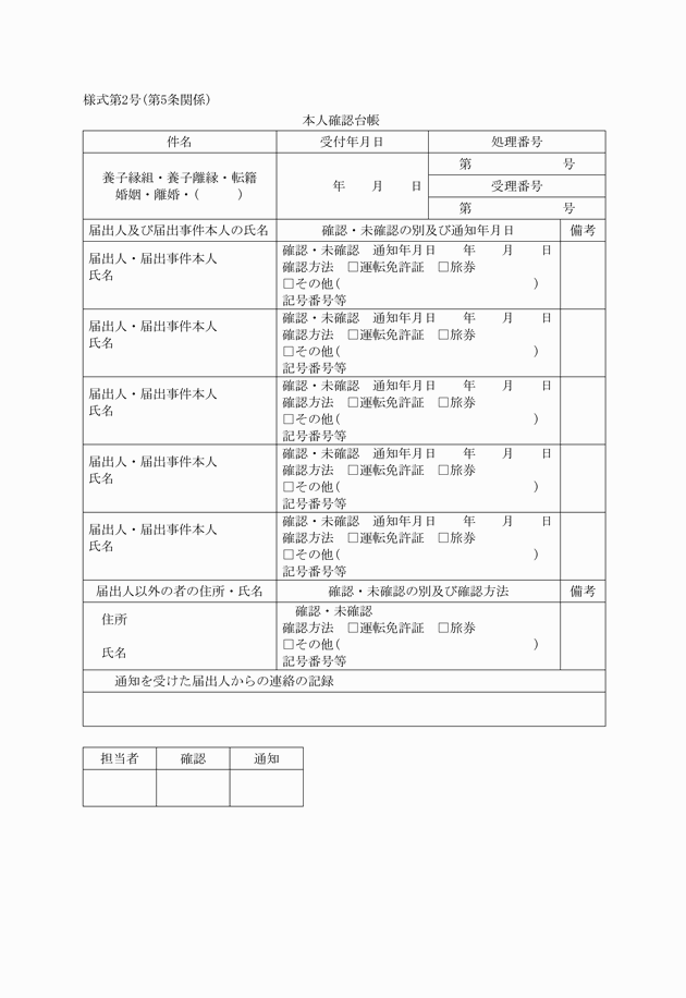 第5条 市長は、本人確認及び通知の経過を本人確認台帳(様式第2号)及び当該届書の欄外に記録しなければならない。