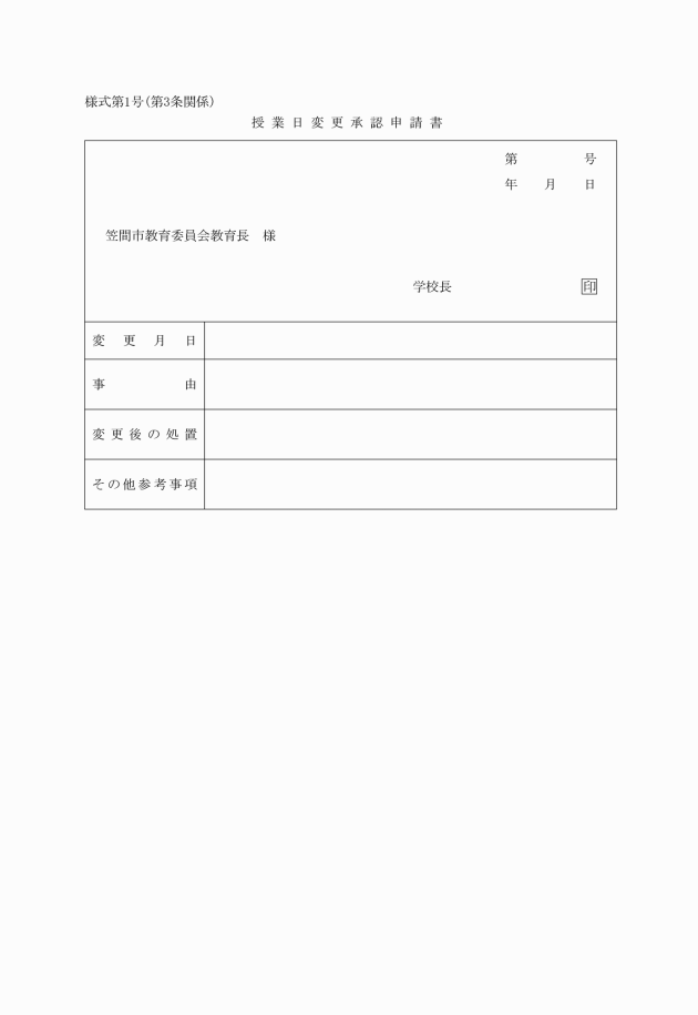 3 校長は、教育上必要があり、かつ、やむを得ない事由があるときは、あらかじめ授業日変更承認申請書(様式第1号)により教育長の承認を得て休業日に授業を行い、授業日を休業日にすることができる。