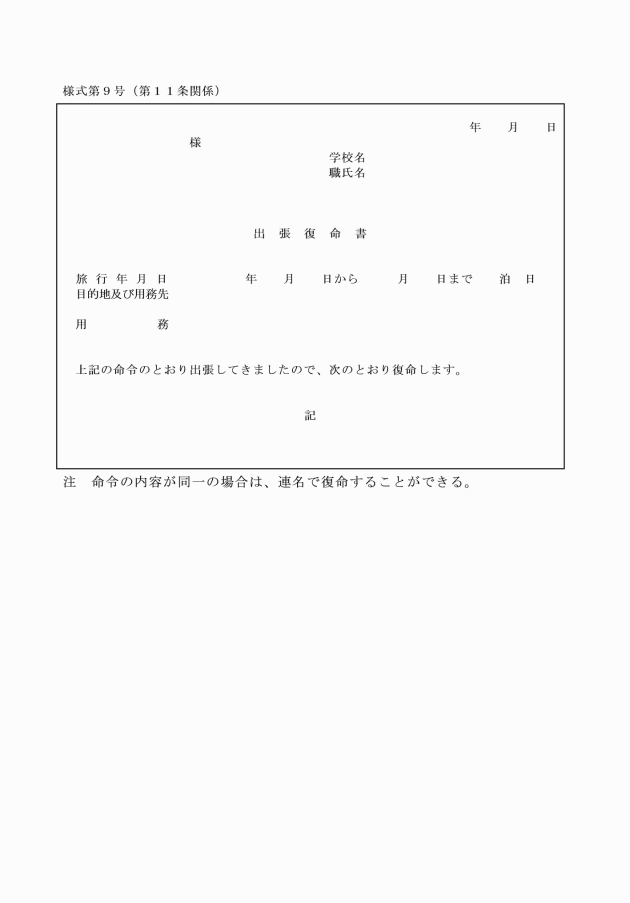 第11条 職員は、出張したときは、帰校後速やかに出張復命書(様式第9号)を旅行命令者に提出しなければならない。ただし、軽易なものは、口頭で復命することができる。