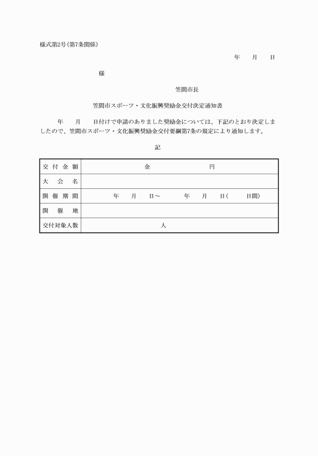 第7条 市長は、奨励金の交付を決定したときは、笠間市スポーツ・文化振興奨励金交付決定通知書(様式第2号)により申請者に通知するものとする。