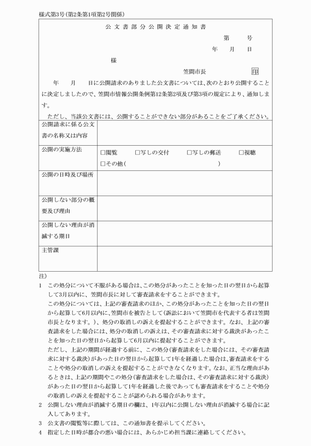 (2) 公文書の一部を公開しない旨の決定をしたとき 公文書部分公開決定通知書(様式第3号)