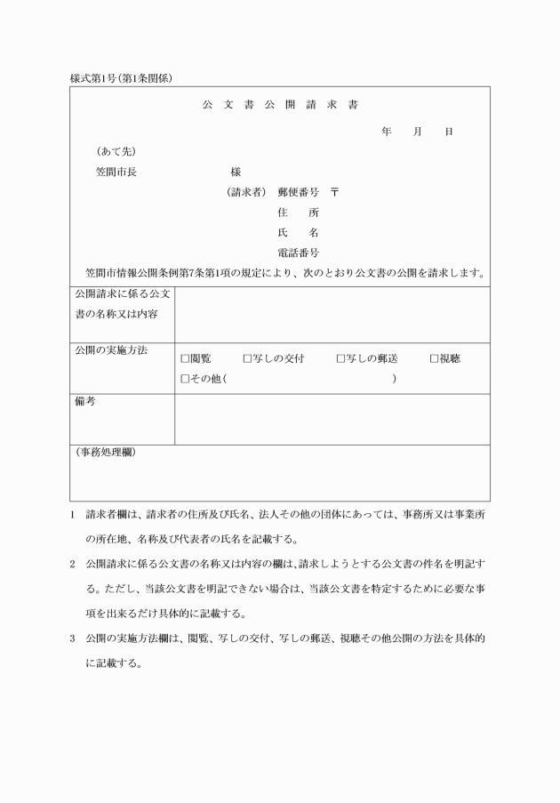 第1条 笠間市情報公開条例(平成18年笠間市条例第246号。以下「条例」という。)第7条第1項に規定する請求書は、公文書公開請求書(様式第1号)による。