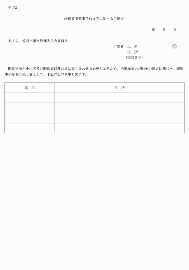 第5条 調査研究等を目的とした閲覧を申出するものは、あらかじめ選挙人名簿抄本閲覧申出書(様式第3号)に所定の事項を記入し、委員会に提出しなければならない。