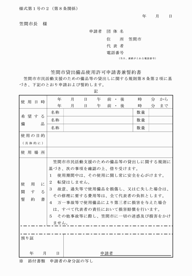 2 貸出備品を使用しようとする団体の代表者等(以下「申請者」という。)は、貸出しを受けようとする日の1箇月前から5日前までの間に、笠間市貸出備品使用許可申請書兼誓約書(様式第1号の2。以下「申請書」という。)に申請者の身分証明書の写しを添えて市長に提出しなければならない。ただし、貸出日の5日前が閉庁日となる場合は、その日前においてその日に最も近い開庁日とする。