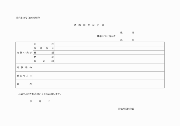 建物滅失証明書 | 氏名(名称)、住所(所在地)、建物の所在、家屋番号、種類、構造、床面積、附属建物、滅失年月日、滅失事由 | ||