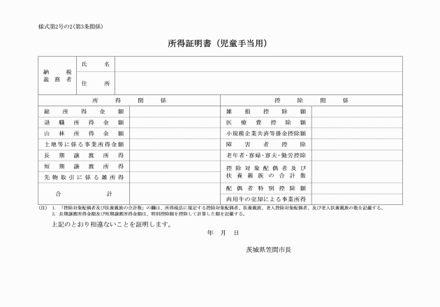 所得証明書(児童手当用) | 氏名、住所 所得金額の合計及びその内訳 所得控除額の内訳 人的控除等の内訳 | ||