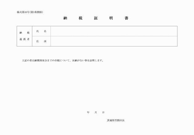 納税証明書 | 納税証明書 | 氏名、住所、税目、課税額、納税額、未納額、納期限未到来分納税額 | |