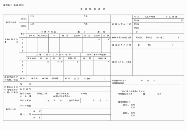 第4条 前条により無届土地取引等の疑いのある事案を把握したときは、必要に応じ現地確認を実施するとともに、次により照会及び事情聴取を行うものとする。