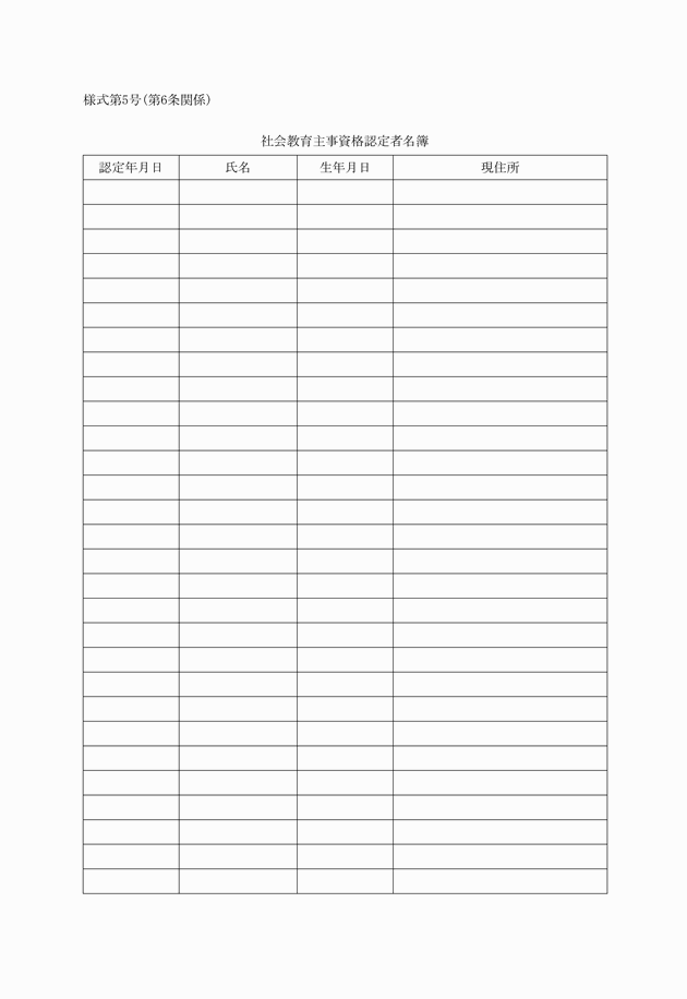 第6条 教育委員会は、社会教育主事資格認定者名簿(様式第5号)を作成し、保存するものとする。