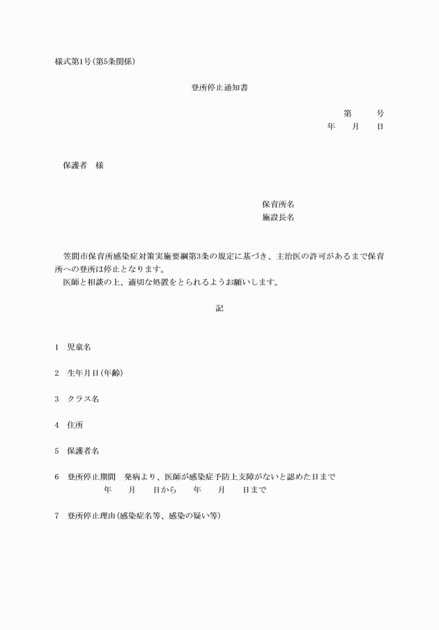 第3条 所長は、次条に規定する疾病等(以下「感染症」という。)に罹患している児童、罹患している疑いがある児童又は罹患するおそれのある児童がいるときは、登所を停止させることができる。