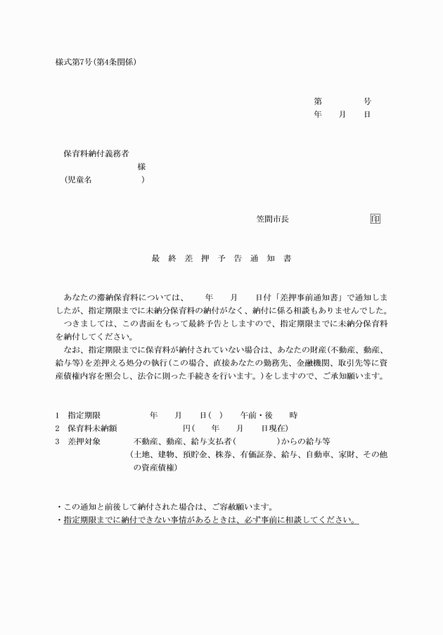 ア 納付期限までに保育料が納付されない場合は、保育料督促状(様式第3号)により納付義務者に通知するものとする。