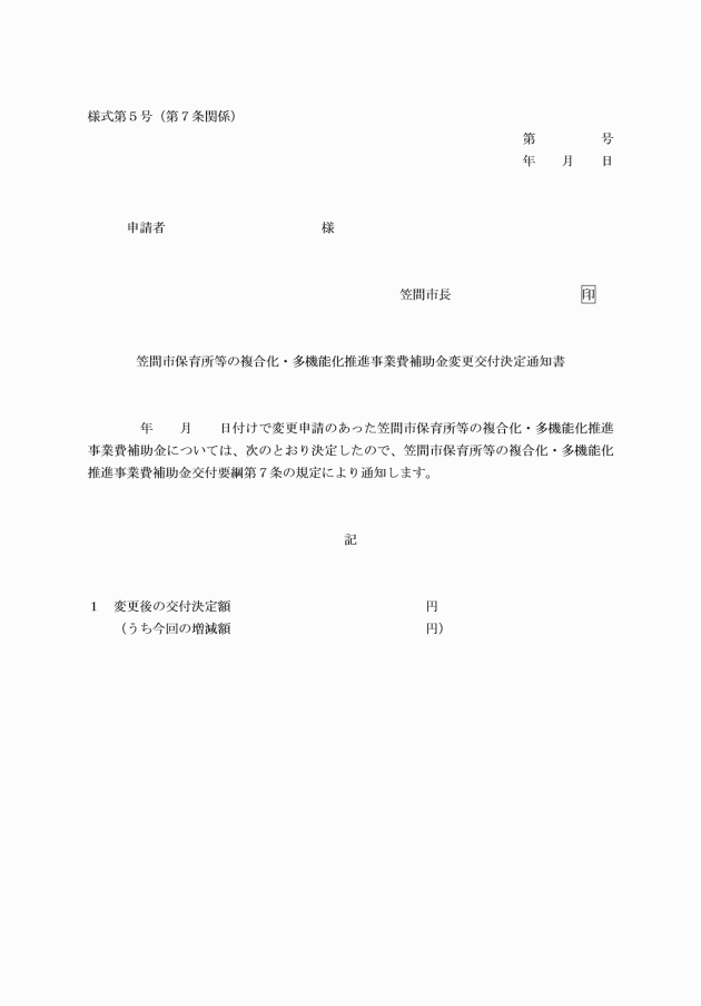 第4条 補助金の交付を受けようとする事業者は、笠間市保育所等の複合化・多機能化推進事業費補助金交付申請書(様式第1号)に次に掲げる書類を添付して、市長に提出しなければならない。