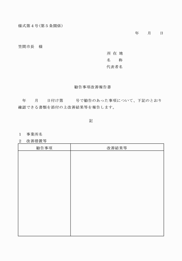 イ 勧告を受けたサービス事業者等は、期限内に勧告事項改善報告書(様式第4号)により報告を行うものとする