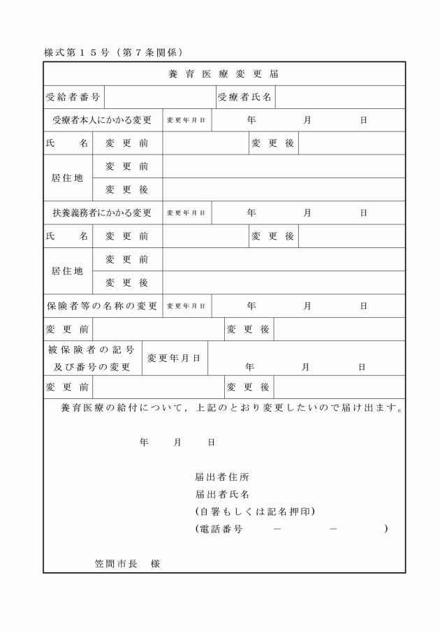 第9条 養育医療券の交付を受けている者が医療機関を変更するときは、養育医療停止報告書(様式第16号)を添付して新たに申請をしなければならない。