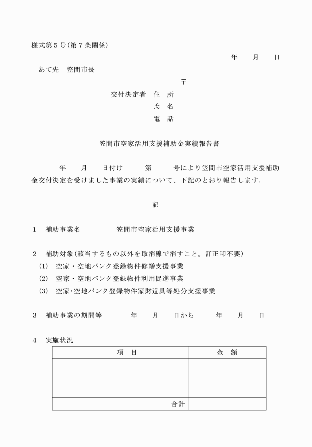 実績報告 | 1 報告期限 修繕工事完了後30日以内又は年度の末日のいずれか早い日 2 添付書類 (1) 修繕工事に要した費用を明らかにできる書類(領収書又はこれに準ずるものの写し) (2) 工事完了後の現場写真 (3) 修繕工事において建築基準法に基づく確認申請を要した場合は、検査済証の写し (4) 住民票の写し(※登録物件所有者が修繕した場合は不要) (5) その他市長が必要と認める書類 |