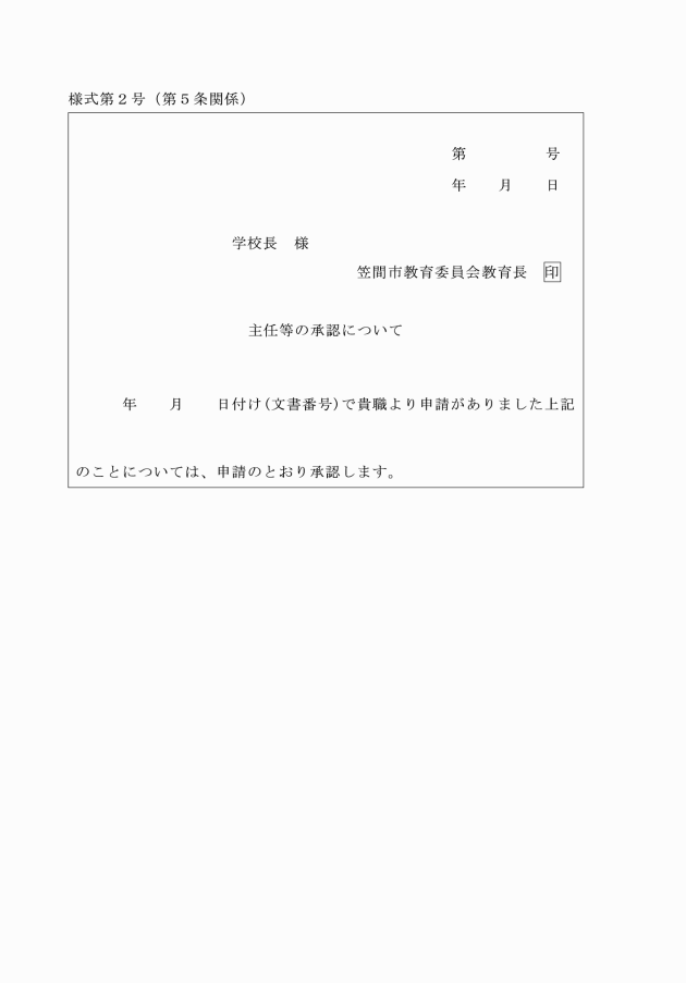 (2) 教育長は、承認申請書に基づき、適当と認めたときは、主任等の承認について(様式第2号)により承認を与えるものとする。