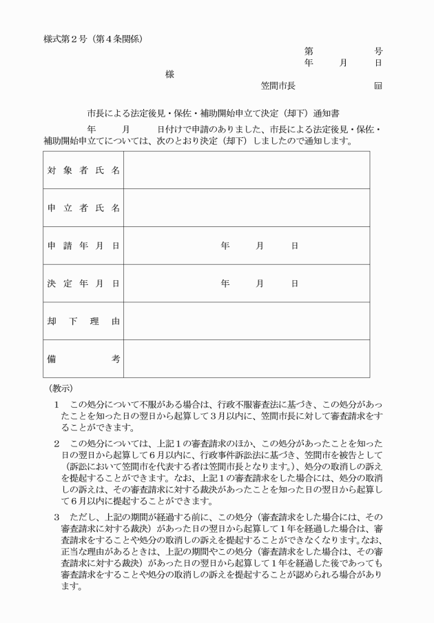 第4条 市長は、審判請求を行うことが適当と認めたとき、又は不適当と認めたときは、市長による法定後見・保佐・補助開始申立決定(却下)通知書(様式第2号)を、当該申出者に通知するものとする。
