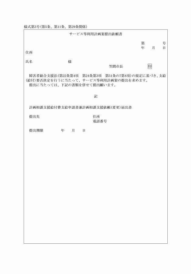 第5条 省令第12条の3の規定による通知は、サービス等利用計画案提出依頼書(様式第3号)により行うものとする。