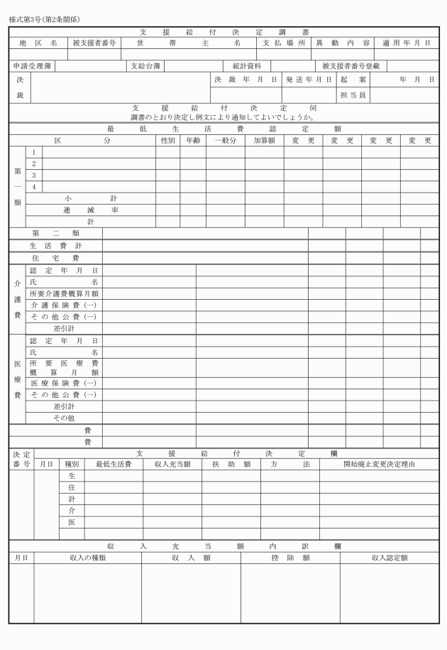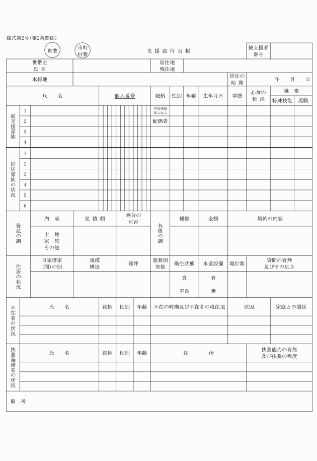 第2条 福祉事務所長は、被支援者(支援給付を受けている者をいう。以下同じ。)につき、次に掲げる書類を作成し、常に、その記載事項について整理しておかなければならない。