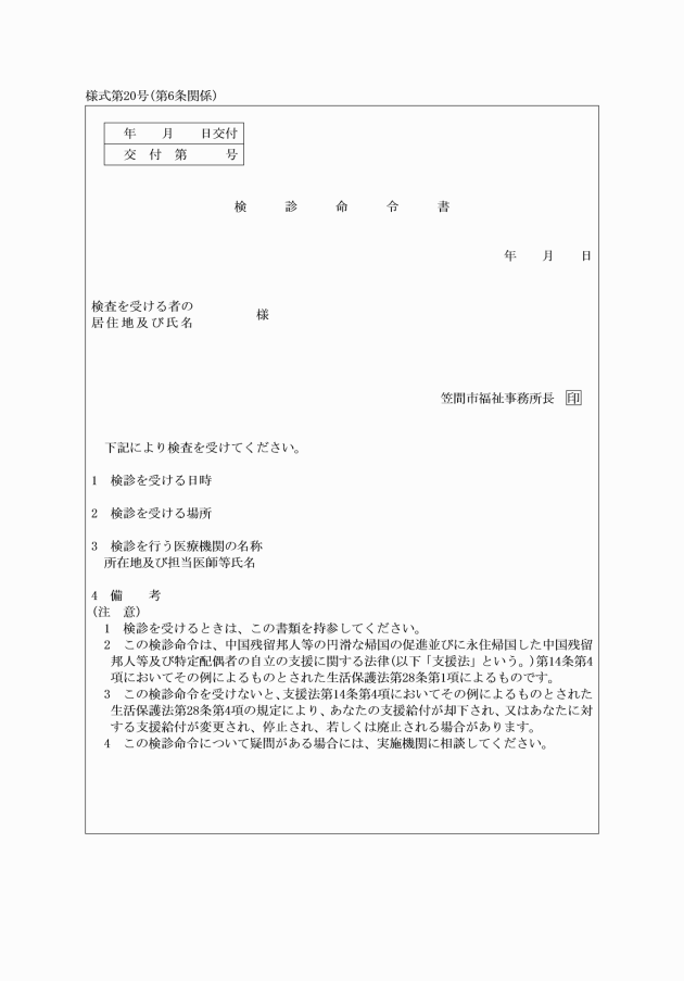 第6条 保護法第28条第1項の規定により検診を受けるべき旨を命ずるときに交付する検診命令書、検診書及び検診料請求書は、様式第20号によるものとする。