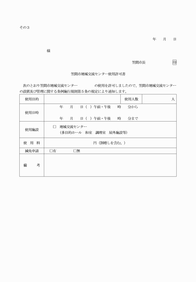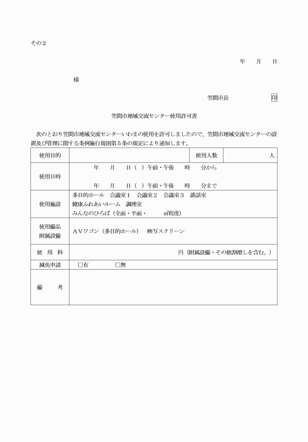 2 市長は、笠間市地域交流センター(以下「交流センター」という。)の使用を許可したときは、笠間市地域交流センター使用許可書(様式第2号)を交付するものとする。
