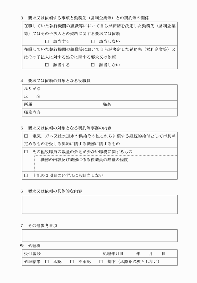 第9条 法第38条の2第6項第6号の規則で定める場合は、同号の要求又は依頼に係る職務上の行為が電気、ガス又は水道水の供給その他これらに類する継続的給付として市長が定めるものを受ける契約に関する職務その他役職員の裁量の余地が少ない職務に関するものである場合とする。