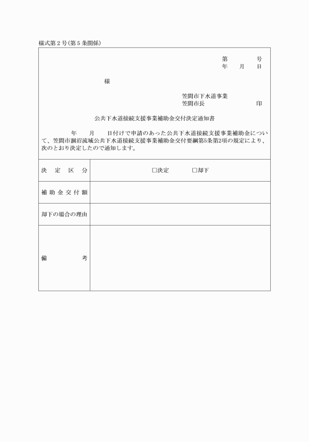 第5条 補助金の交付を受けようとする者は、設置工事を行う前に公共下水道接続支援事業補助金交付申請書(様式第1号)に次に掲げる書類を添付して管理者に提出しなければならない。
