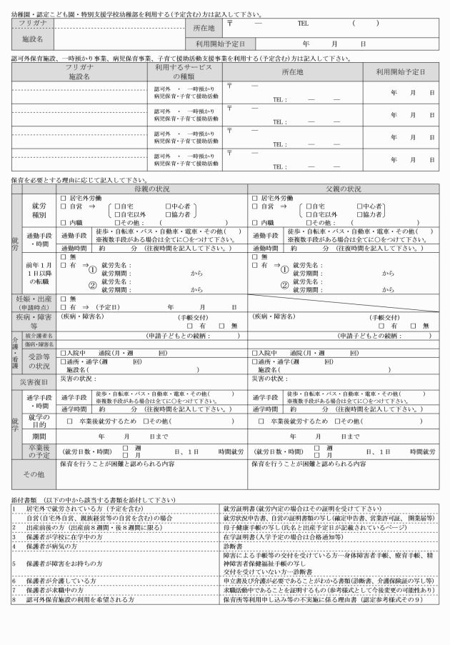2 保育認定を受けようとする者は、教育・保育給付認定申請書に次に掲げるもののうち、必要な書類を添えて市長に提出しなければならない。