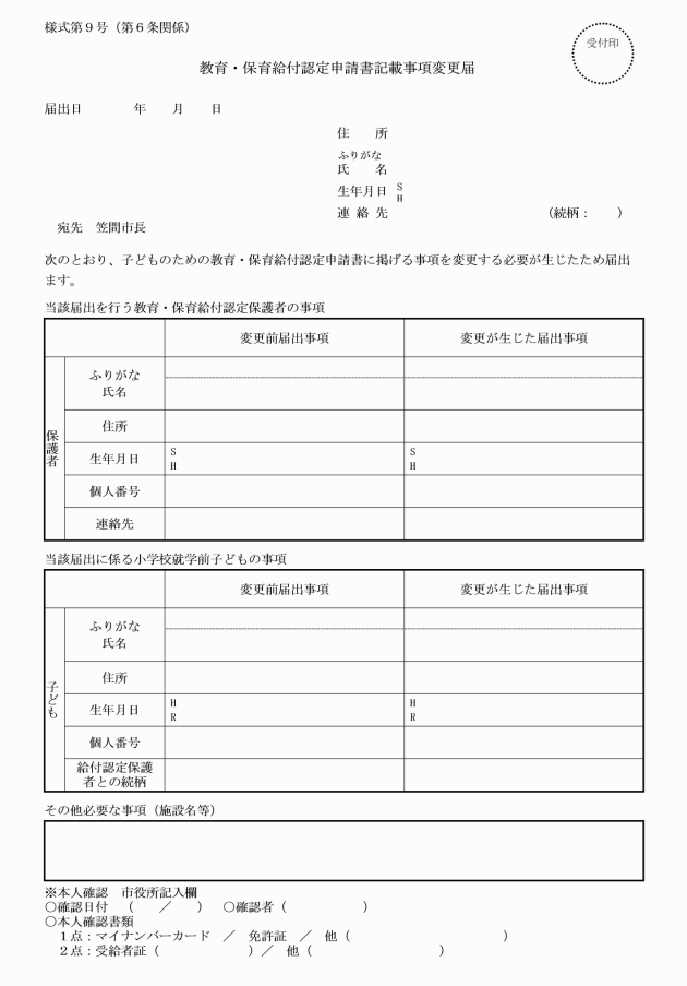 第6条 府令第15条の規定に基づき提出した書類の記載事項に変更があったときは、教育・保育給付認定申請書記載事項変更届(様式第9号。以下「変更届」という。)に変更の事項を証する書類及び支給認定証を添えて、市長に提出しなければならない。