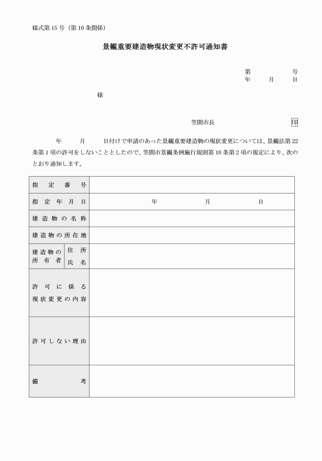 第8条 法第21条第1項の規定による通知は、景観重要建造物指定通知書(様式第11号)によるものとする。