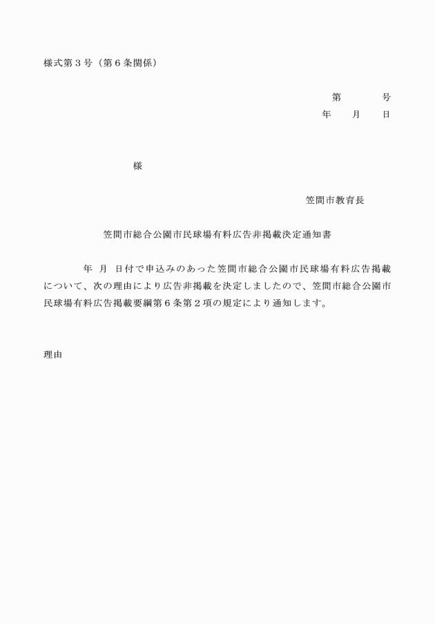 第6条 広告を掲載しようとする者(以下「申込者」という。)は、笠間市総合公園市民球場有料広告掲載申込書(様式第1号)に申込者の負担により作成した広告の案を添えて教育長に提出しなければならない。