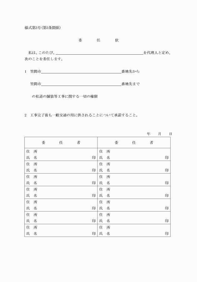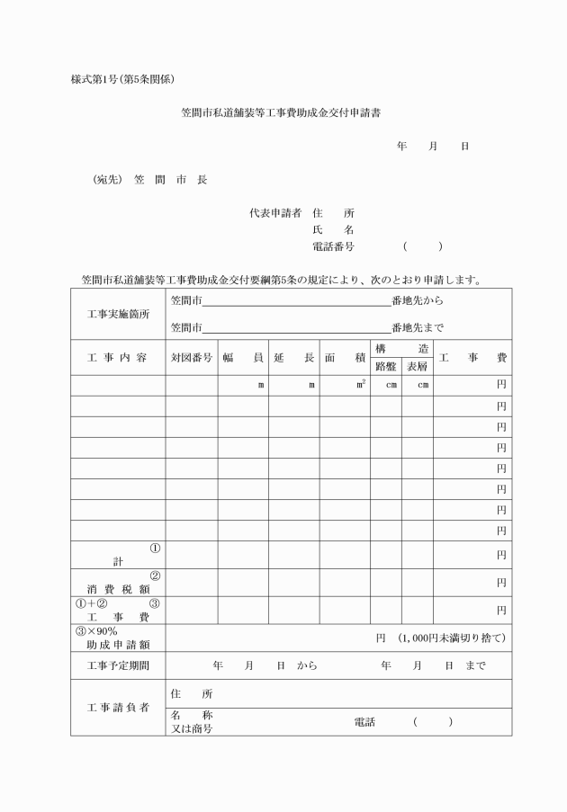 第5条 助成金の交付を受けようとする者(以下「代表申請者」という。)は、笠間市私道舗装等工事費助成金交付申請書(様式第1号)に次に掲げる書類を添えて市長に提出しなければならない。
